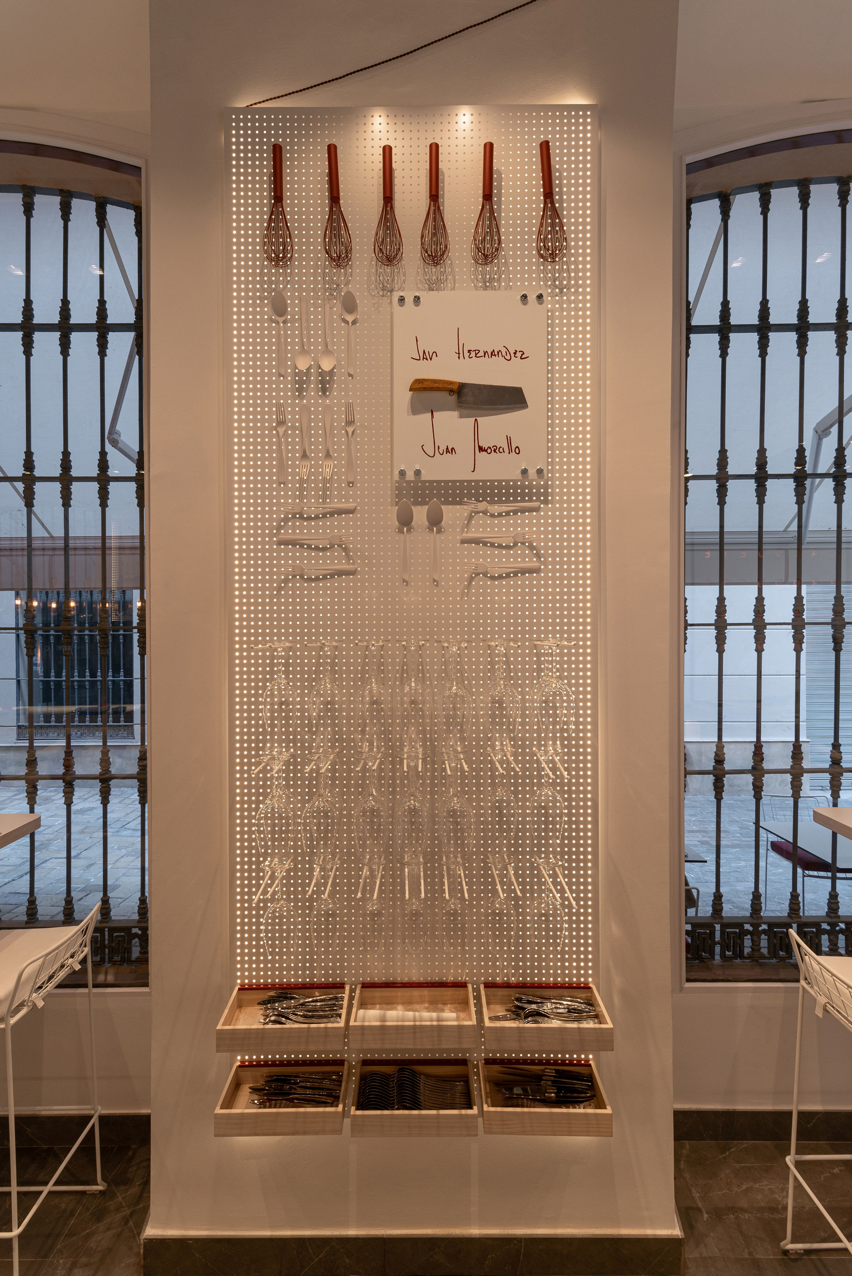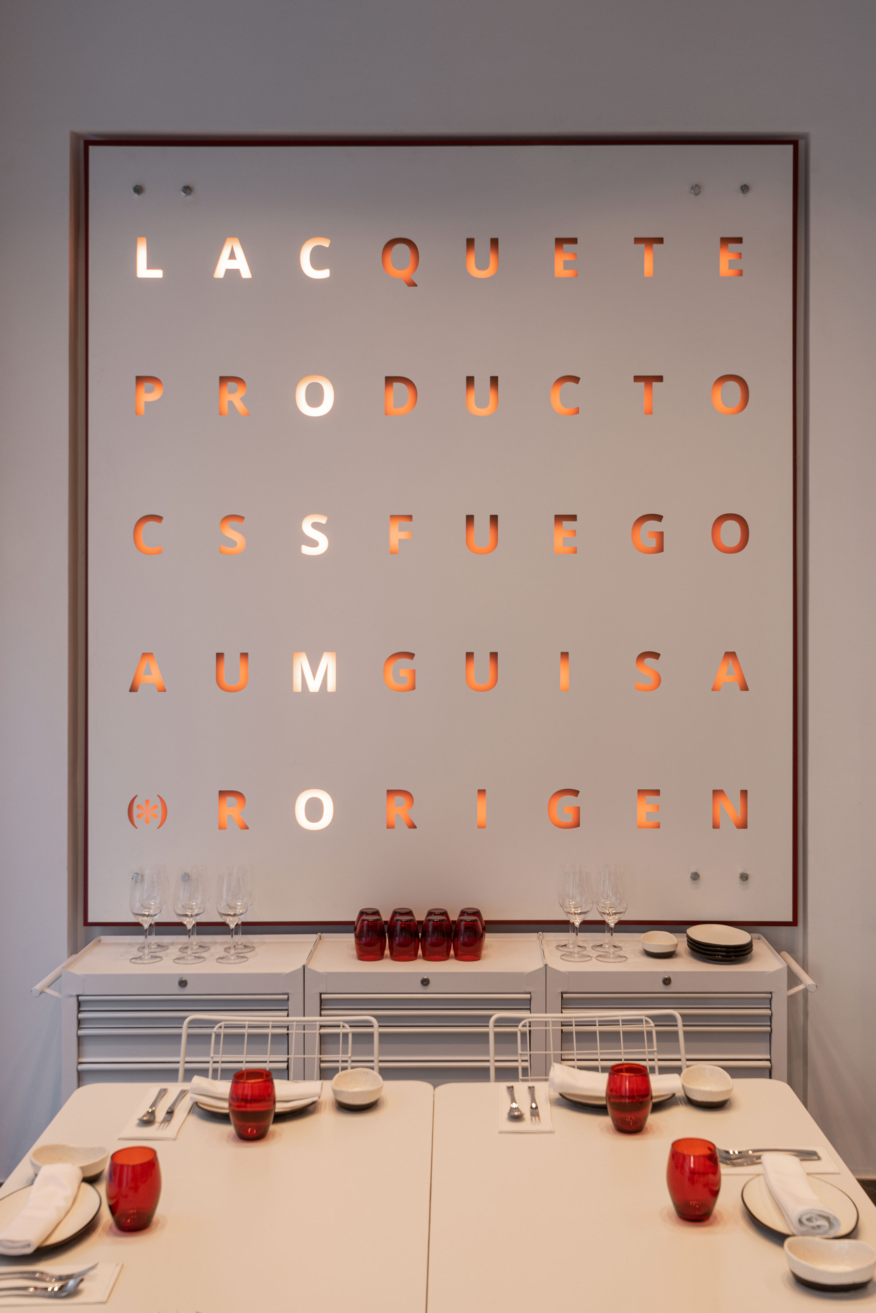 El proyecto ha incluido la fabricación e instalación de un cuadro retroiluminado fresado por CNC inspirado en una sopa de letras, elementos corpóreos personalizados, vinilos decorativos y un copero expositivo diseñado con chapa perforada, todo integrado con el estilo singular y sofisticado del restaurante.